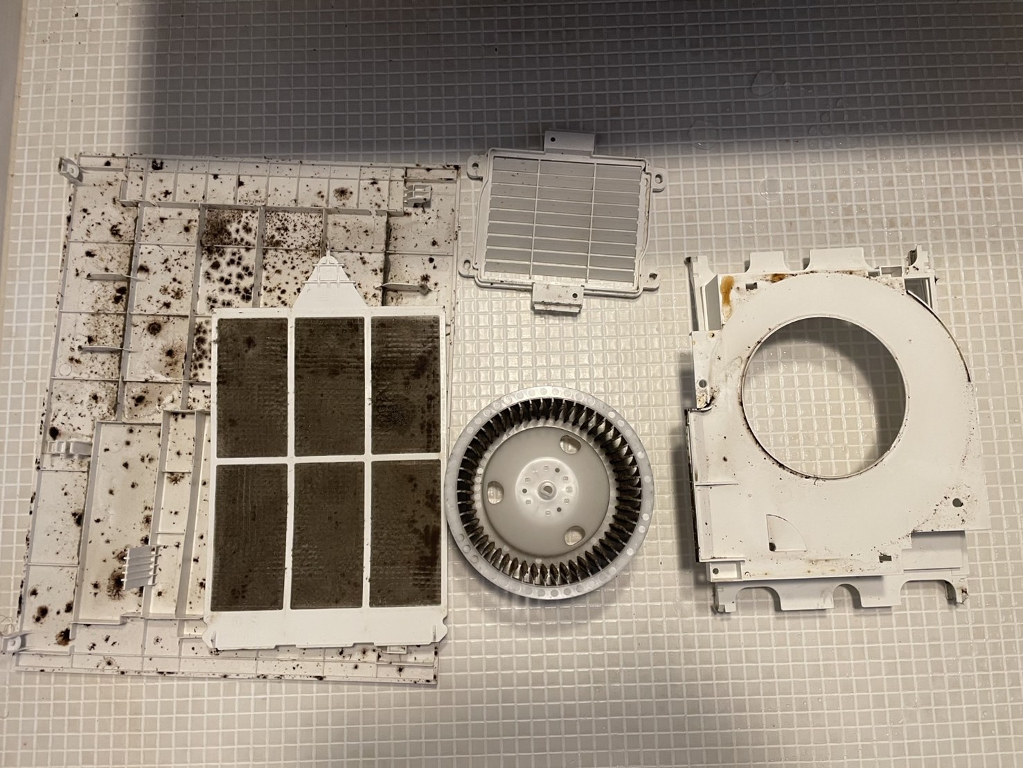 今回もエアコンクリーニングへご依頼先へ🚙 いざ分解・高圧洗浄してみると、中からは 真っ黒なカビとホコリ・・・【業務用エアコンクリーニング】ビフォーアフター